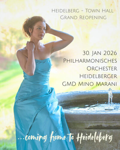 h freue mich besonders, dass ich zur Eröffnung der renovierten Stadthalle in meiner Heimatstadt Heidelberg, am 30. Januar in einem Galakonzert auftreten darf mit den Philharmonischen Orchester Heidelberg unter der Leitung von Generalmusikdirektor Mino Marani gemeinsam mit Uwe Stickert als Tenor mit meinem Alltime Favorite Mozart.